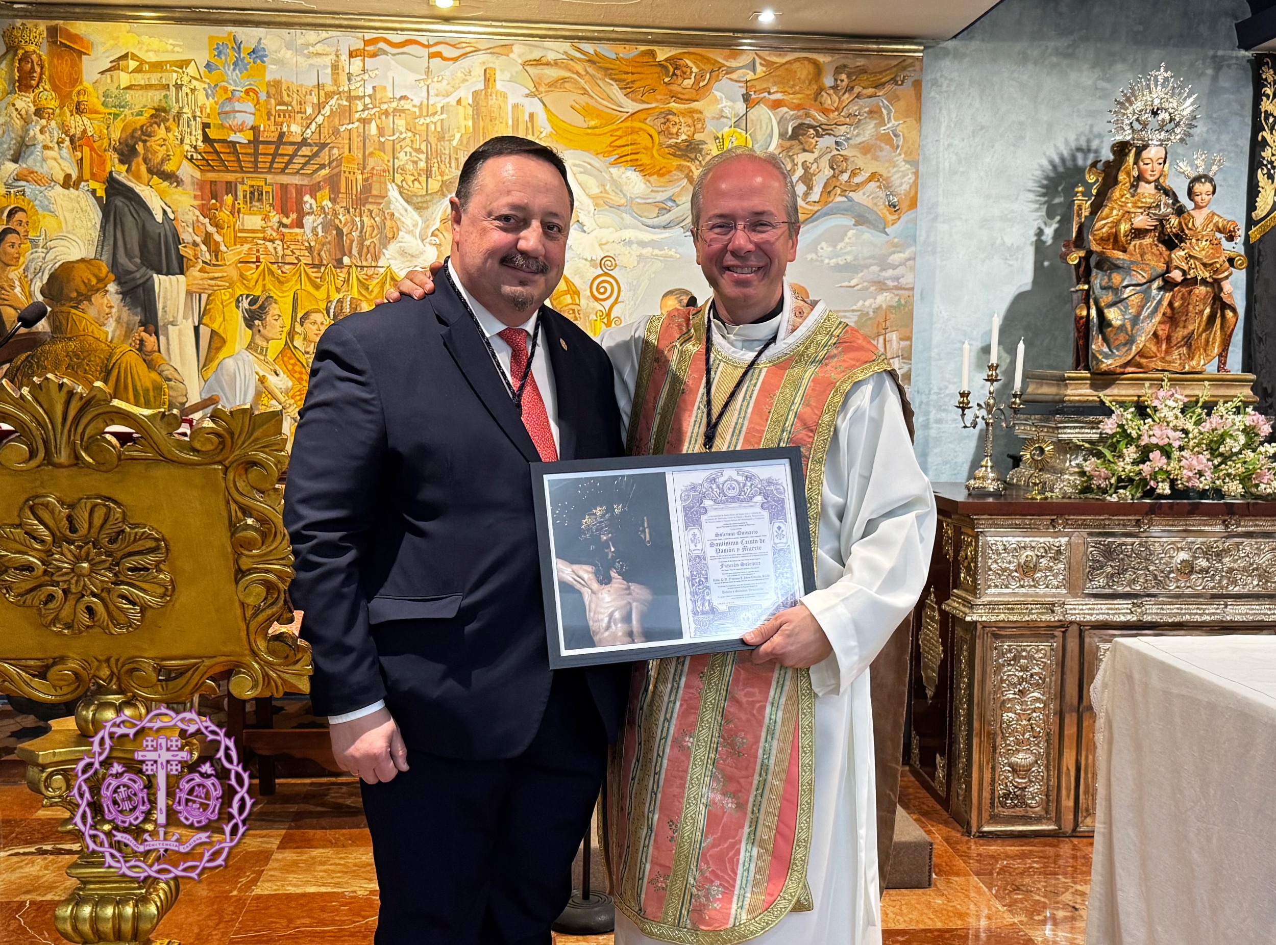 El pasado domingo, 30 de marzo, tras la finalización de la Función Solemne en honor al Stmo. Cristo de Pasión y Muerte, nuestro Hermano Mayor agradeció públicamente al Rvdo. P. N.H.D. Francisco José Pérez Camacho, SDB, su oficio en estos Solemnes Cultos, haciendo entrega de un cuadro conmemorativo.
