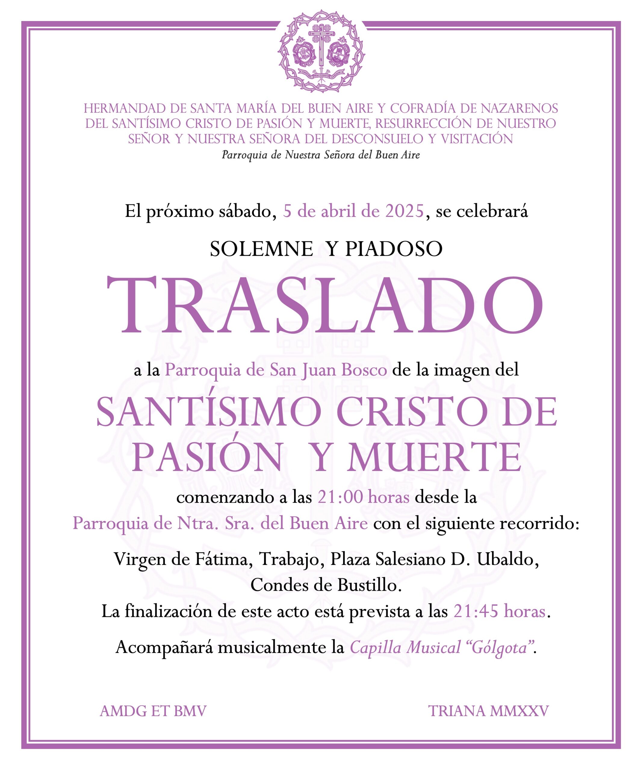 Se informa que los próximos días 5 y 12 de abril se realizarán los Traslados de ida y vuelta, respectivamente, a la Parroquia de San Juan Bosco de la imagen del Santísimo Cristo de Pasión y Muerte para la Estación de Penitencia del próximo Viernes de Dolores. Aquellos hermanos interesados en participar en estos cortejos, rogamos se pongan en contacto con el Diputado Mayor de Gobierno.