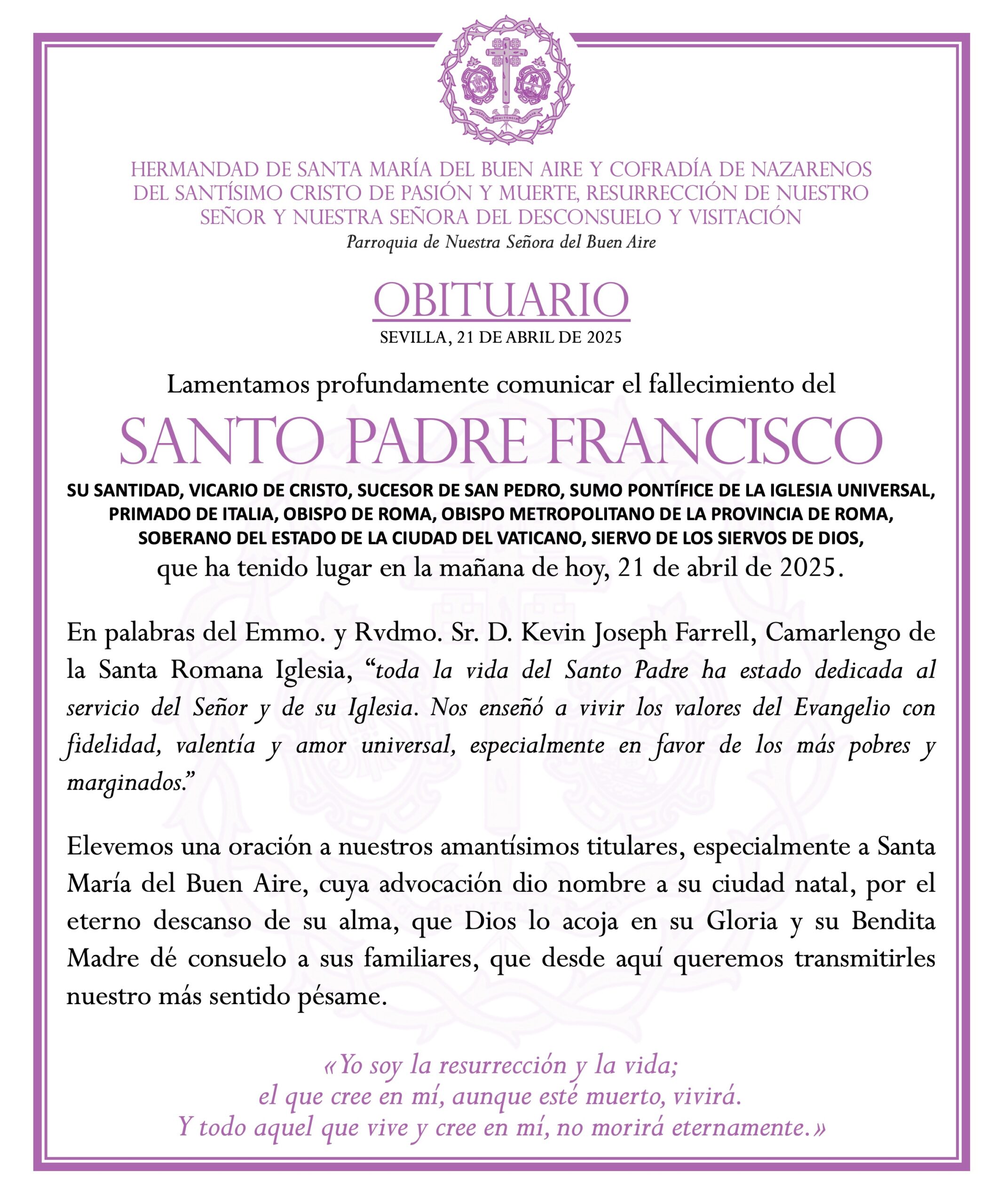 Lamentamos profundamente comunicar el fallecimiento del Santo Padre Francisco, que ha tenido lugar en la mañana de hoy, 21 de abril de 2025.