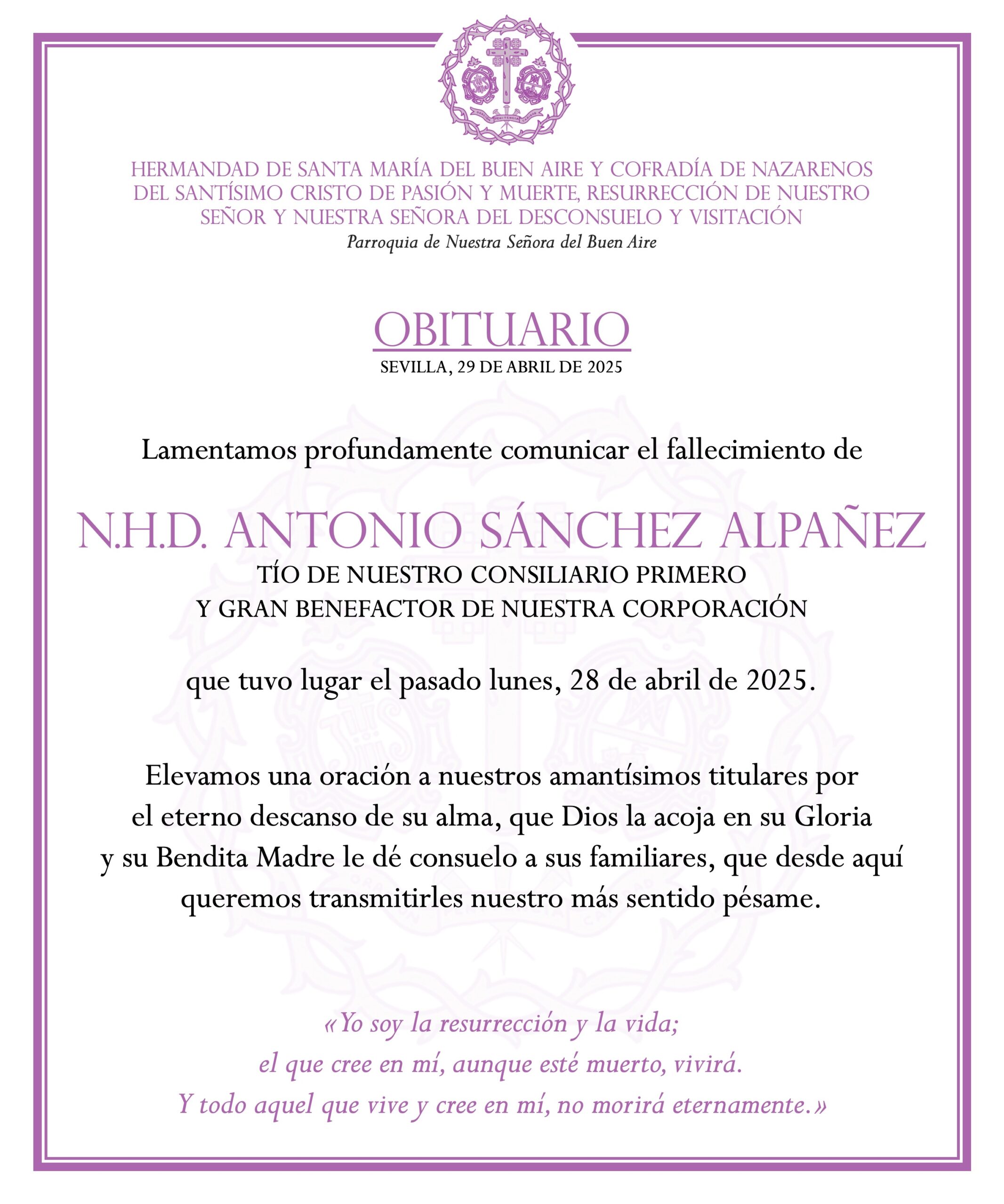 Lamentamos profundamente comunicar el fallecimiento de N.H.D. Antonio Sánchez Alpañez, tío de nuestro Consiliario Primero y gran benefactor de nuestra corporación, que tuvo lugar el pasado lunes, 28 de abril de 2025.