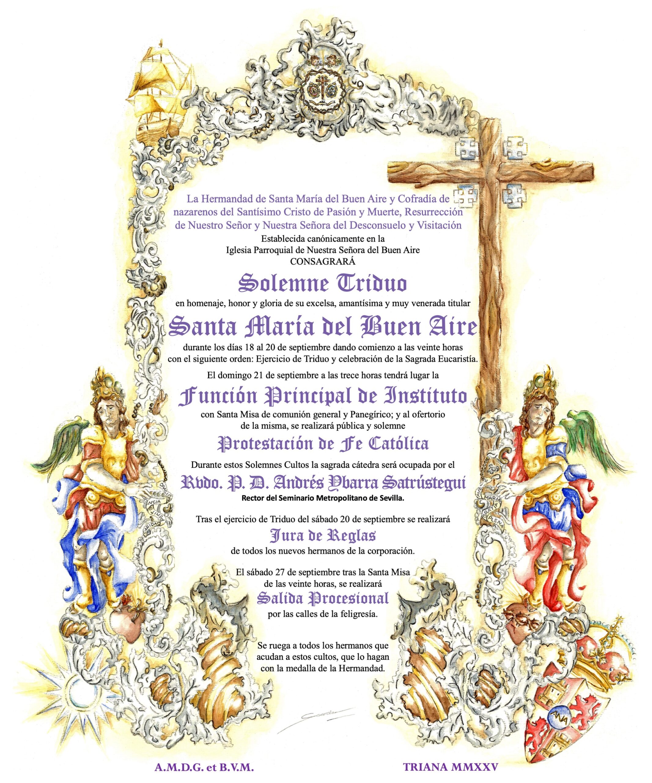 El próximo jueves, 18 de septiembre, comenzará el Solemne Triduo en honor a Santa María del Buen Aire, teniendo lugar a las 20:00 horas en nuestra Sede Canónica, la Parroquia de Ntra. Sra. del Buen Aire. Tras el ejercicio de Solemne Triduo del sábado, 20 de septiembre, se realizará Jura de Reglas de nuevos hermanos.