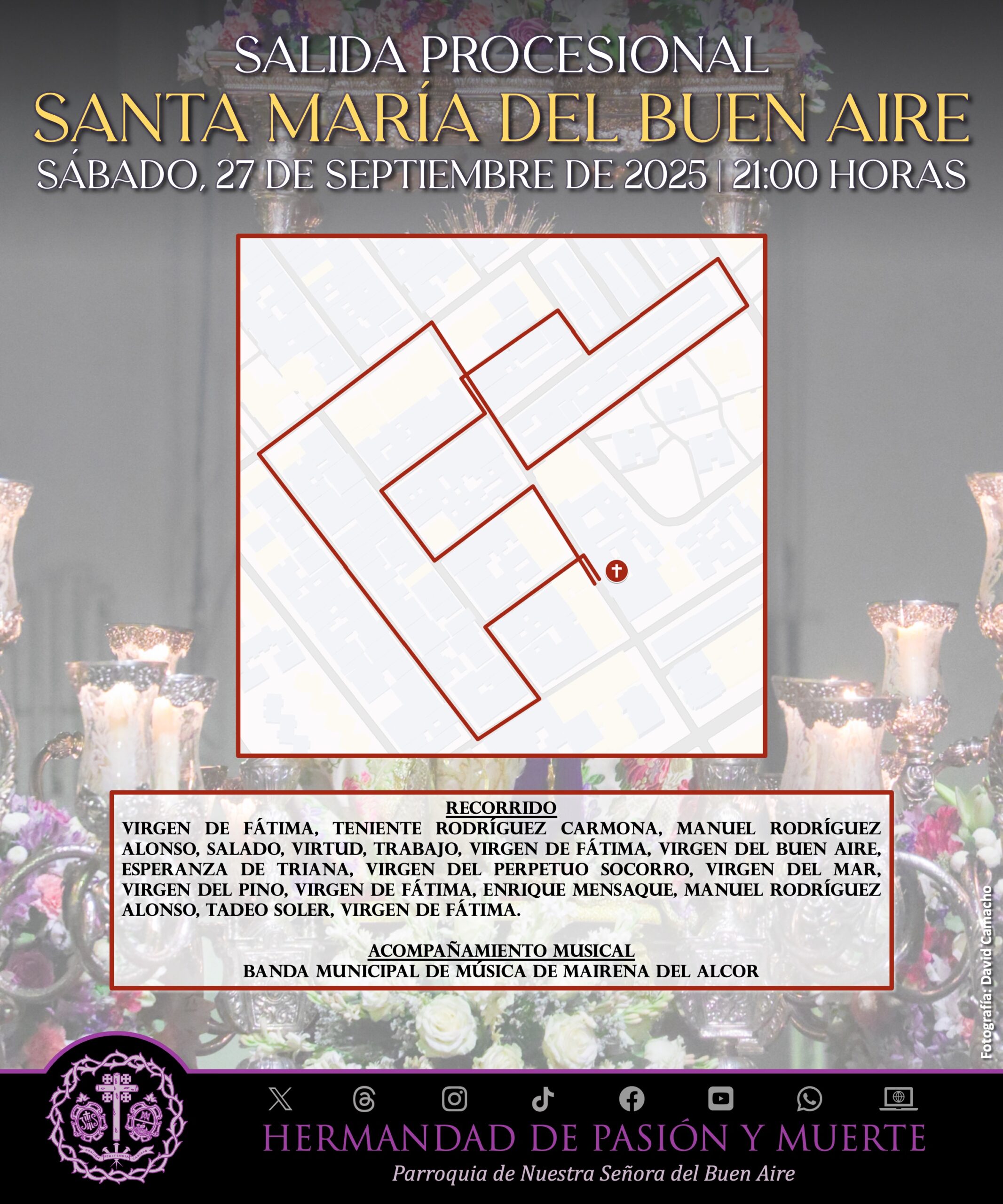 Tendremos el acompañamiento musical de la Banda Municipal de Música de Mairena del Alcor. Al mando de la cuadrilla de costaleros estará N.H.D. Manuel Vizcaya López.