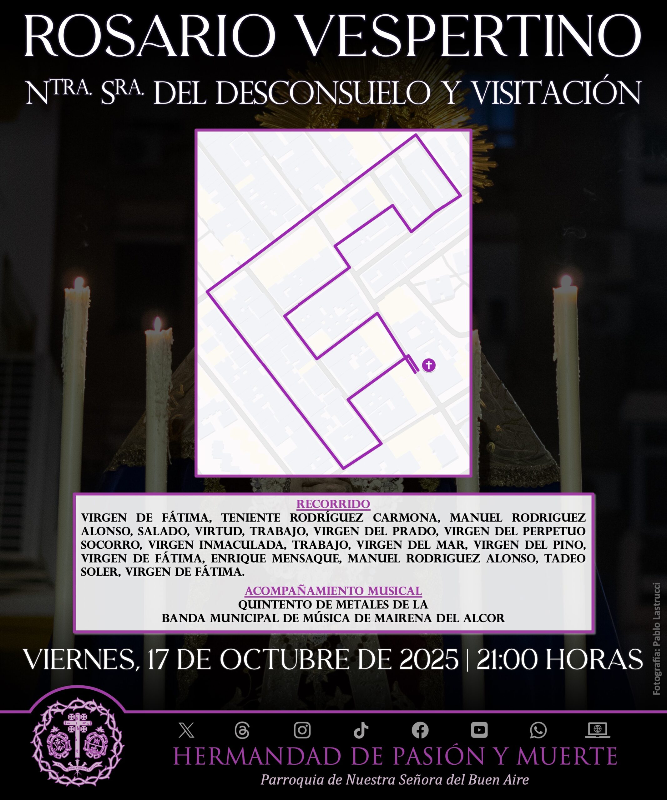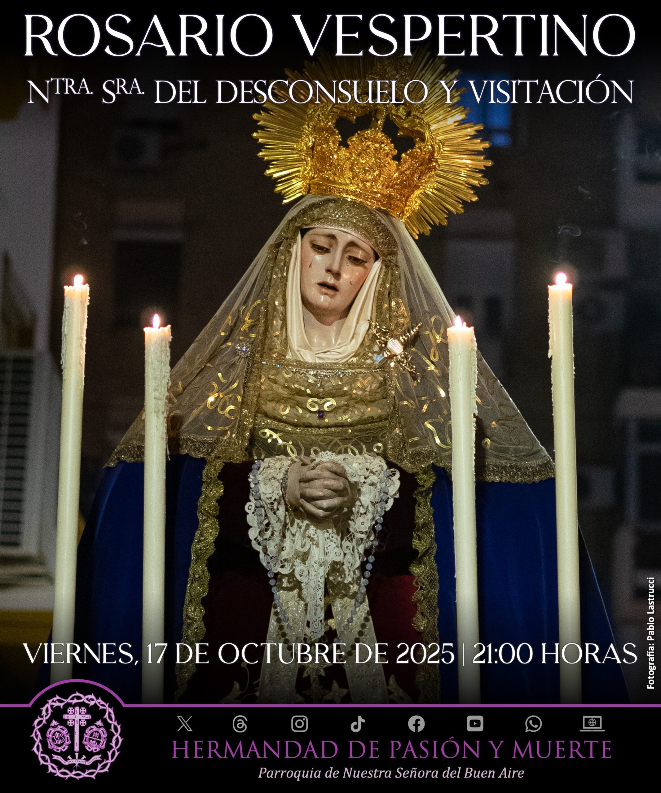 El próximo viernes, 17 de octubre, tras la celebración de la Misa de 20:00 horas, tendrá lugar rezo del Santo Rosario presidido por la imagen de Ntra. Sra. del Desconsuelo y Visitación por las calles de su feligresía.