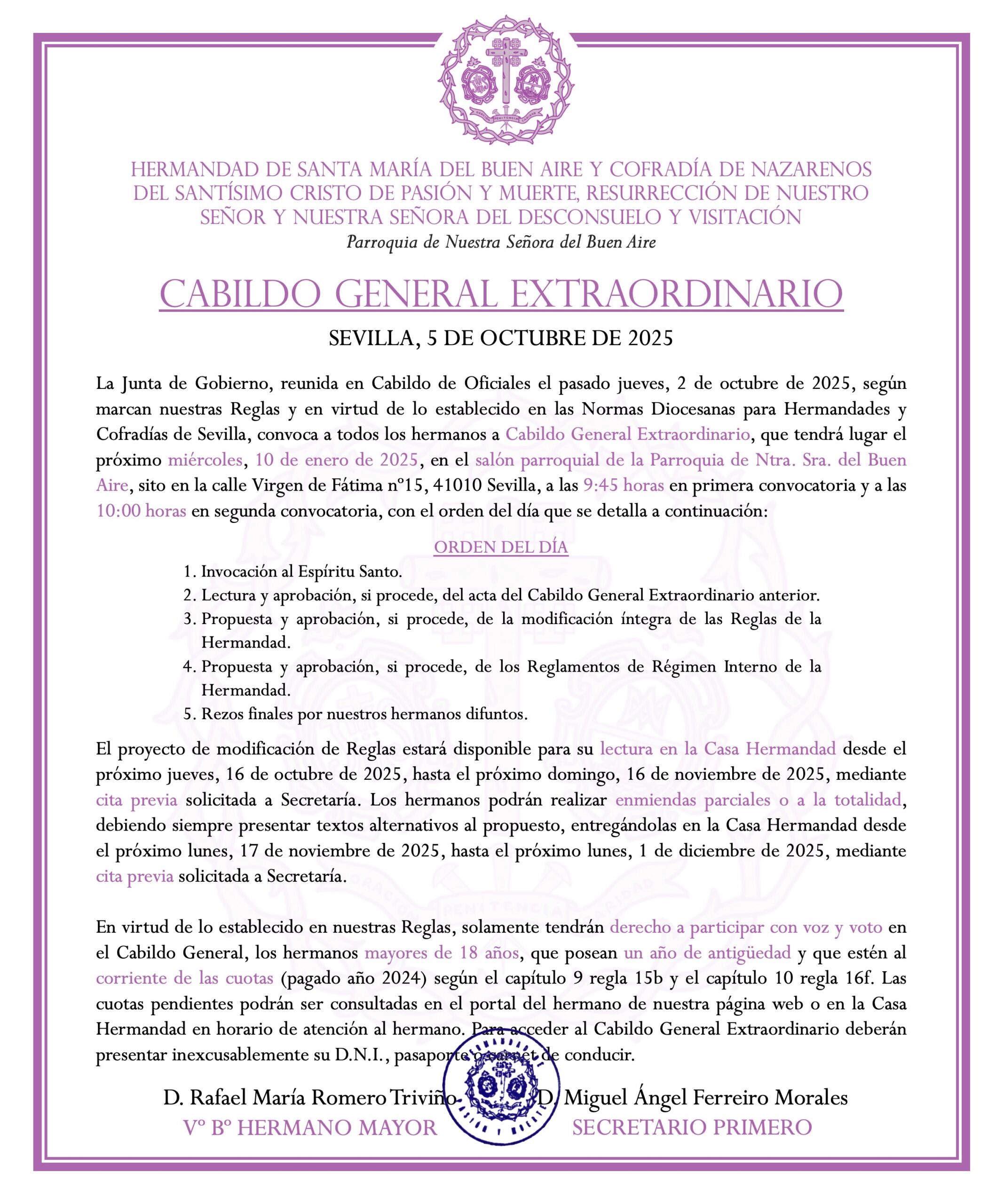 La Junta de Gobierno, reunida en Cabildo de Oficiales el pasado jueves, 2 de octubre de 2025, según marcan nuestras Reglas y en virtud de lo establecido en las Normas Diocesanas para Hermandades y Cofradías de Sevilla, convoca a todos los hermanos a Cabildo General Extraordinario, que tendrá lugar el próximo miércoles, 10 de enero de 2025, en el salón parroquial de la Parroquia de Ntra. Sra. del Buen Aire, sito en la calle Virgen de Fátima nº15, 41010 Sevilla, a las 9:45 horas en primera convocatoria y a las 10:00 horas en segunda convocatoria, con el orden del día que se detalla a continuación: