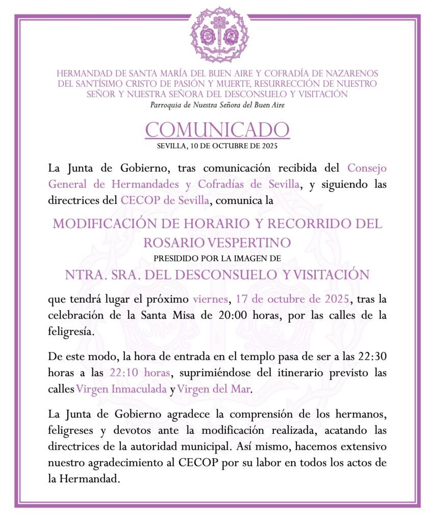 La Junta de Gobierno, tras comunicación recibida del Consejo General de Hermandades y Cofradías de Sevilla, y siguiendo las directrices del CECOP de Sevilla, comunica la modificación de horario y recorrido del Rosario Vespertino presidido por la imagen de Ntra. Sra. del Desconsuelo y Visitación, que tendrá lugar el próximo viernes, 17 de octubre de 2025, tras la celebración de la Santa Misa de 20:00 horas, por las calles de la feligresía.