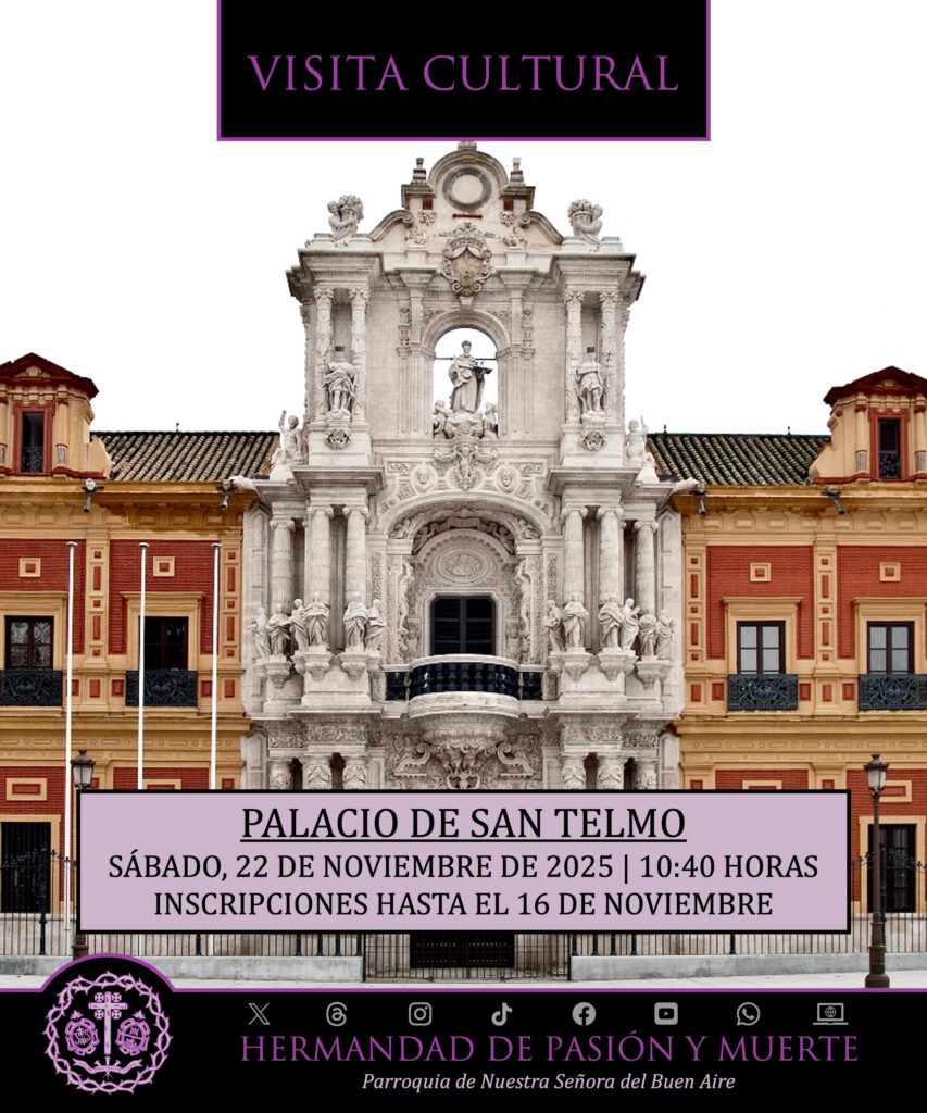 El próximo sábado, 22 de noviembre de 2025, a las 10:40 horas, nuestra Hermandad realizará una visita cultural al Palacio de San Telmo, sede de la Presidencia de la Junta de Andalucía, continuando con el calendario de visitas culturales. Se accederá, presentando el D.N.I., por la puerta lateral ubicada en la calle Palos de la Frontera.
