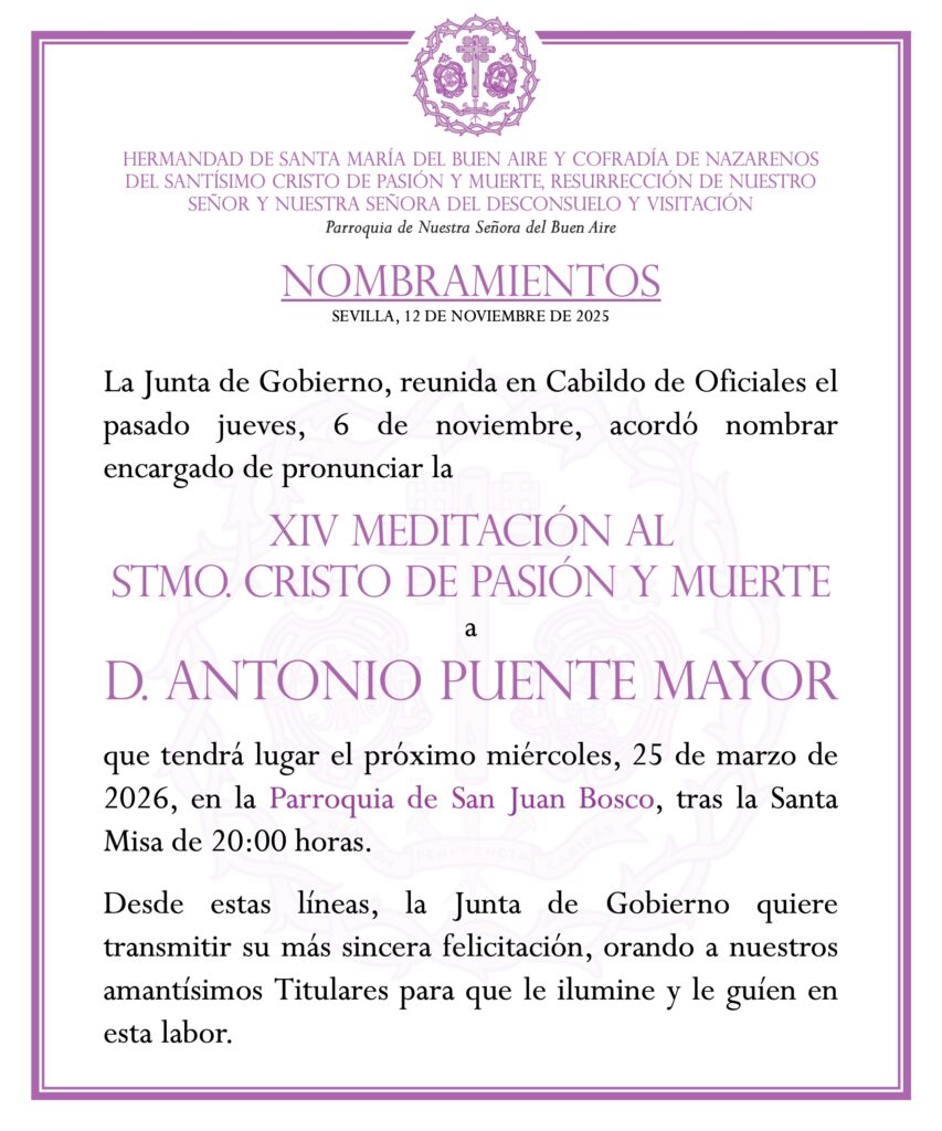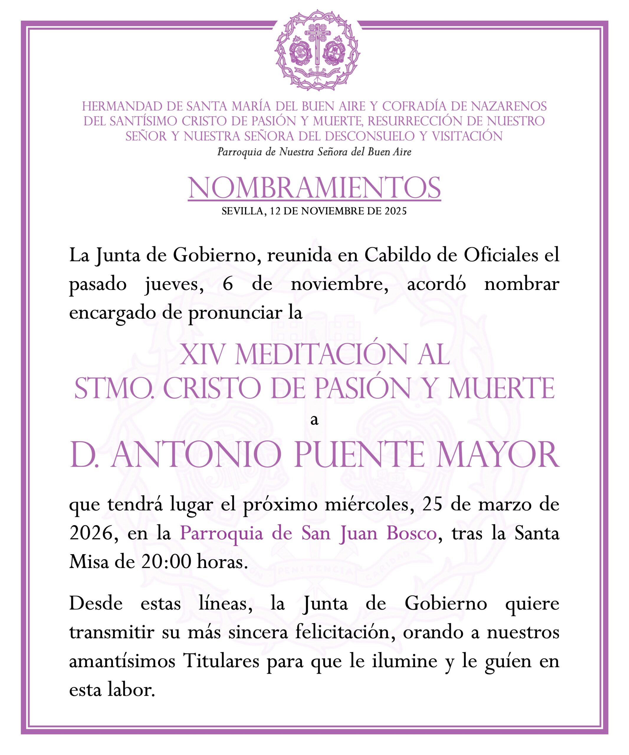 La Junta de Gobierno, reunida en Cabildo de Oficiales el pasado jueves, 6 de noviembre, acordó nombrar encargado de pronunciar la XIV Meditación al Stmo. Cristo de Pasión y Muerte a D. Antonio Puente Mayor, que tendrá lugar el próximo miércoles, 25 de marzo de 2026, en la Parroquia de San Juan Bosco tras la Santa Misa de 20:00 horas.