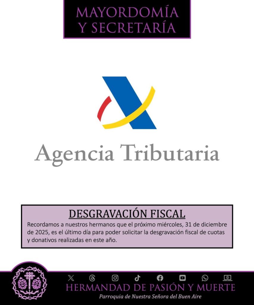 Recordamos a nuestros hermanos que el próximo miércoles, 31 de diciembre de 2025, es el último día para poder solicitar la desgravación fiscal de cuotas y donativos realizadas en este año.