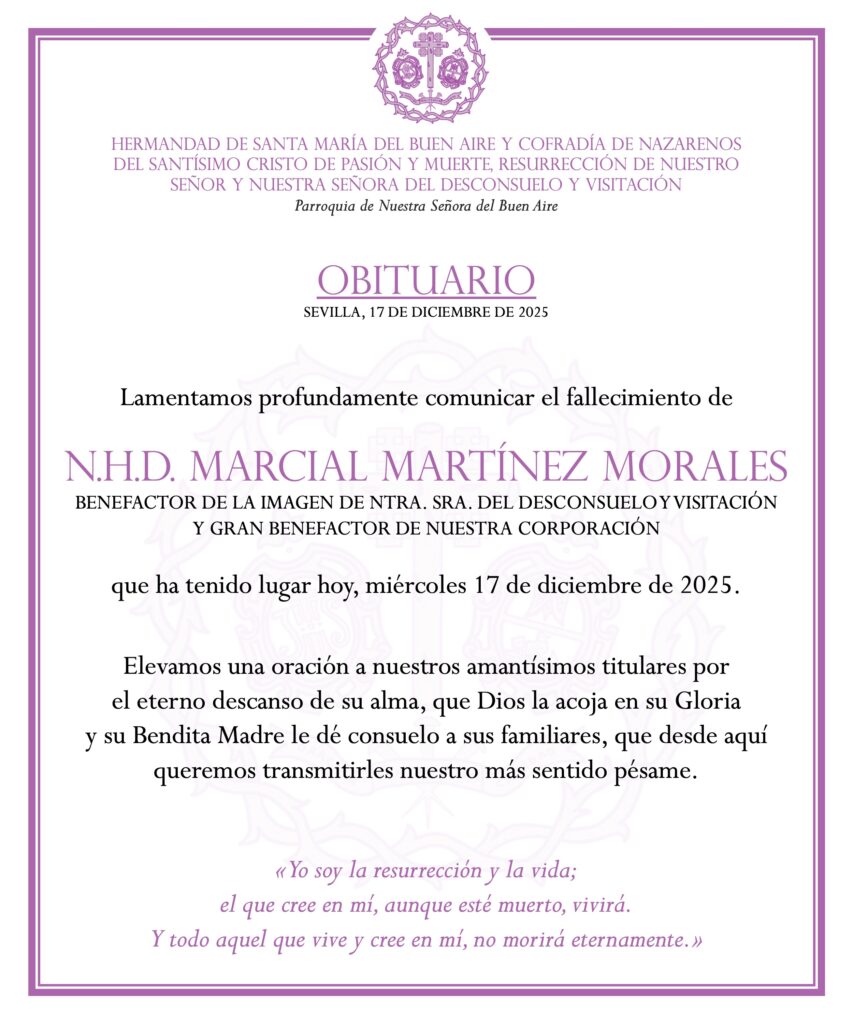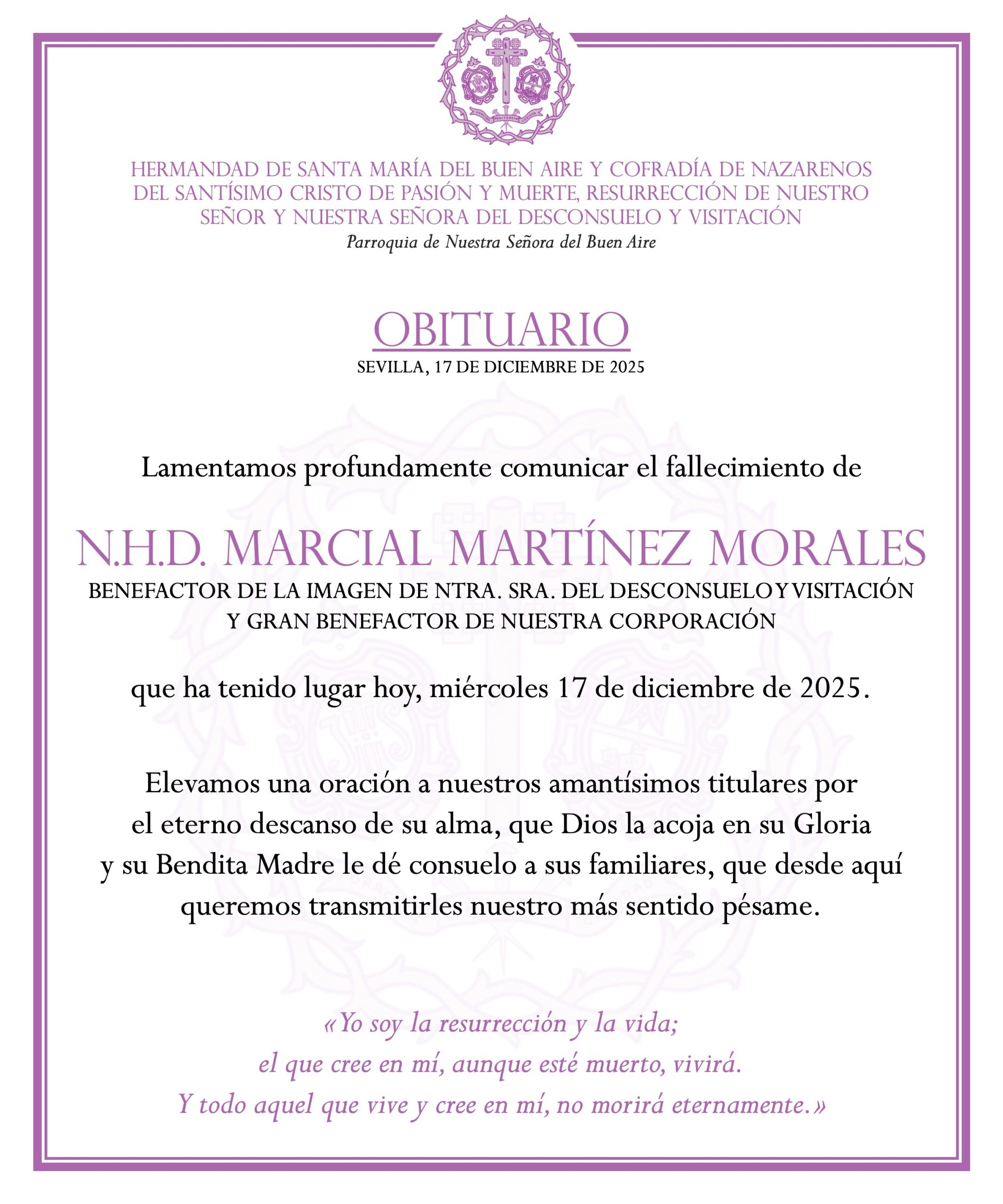 Lamentamos profundamente comunicar el fallecimiento de N.H.D. Marcial Martínez Morales, benefactor de la imagen de Ntra. Sra. del Desconsuelo y Visitación y gran benefactor de nuestra corporación, que ha tenido lugar hoy, miércoles 17 de diciembre de 2025.