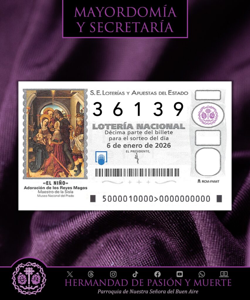Una vez agotadas todas las existencias de décimos y participaciones de la lotería de Navidad, informamos a nuestros hermanos que están a disposición de todos, los décimos y las participaciones de la lotería del Niño de nuestra Hermandad con el número 36139.
