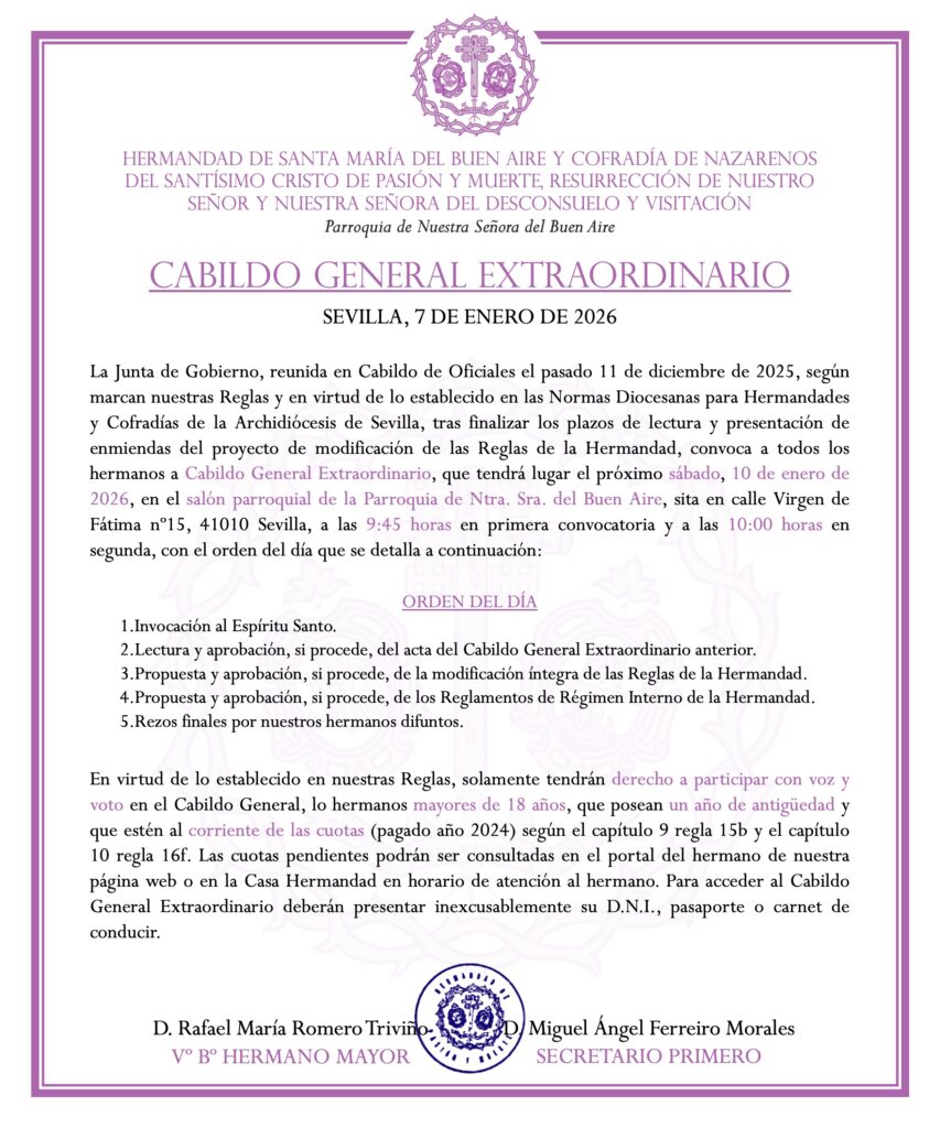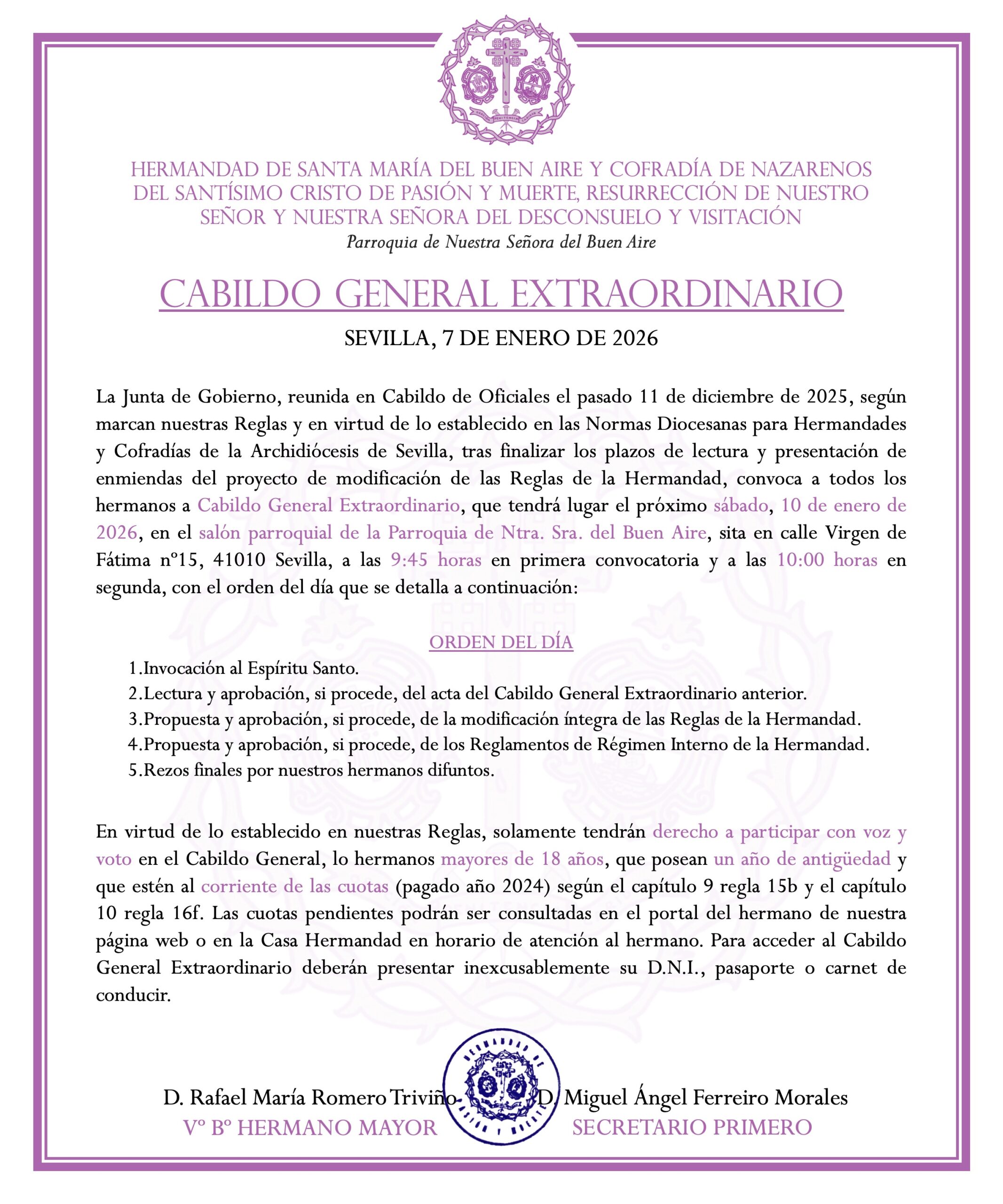 La Junta de Gobierno, reunida en Cabildo de Oficiales el pasado 11 de diciembre de 2025, según marcan nuestras Reglas y en virtud de lo establecido en las Normas Diocesanas para Hermandades y Cofradías de la Archidiócesis de Sevilla, tras finalizar los plazos de lectura y presentación de enmiendas del proyecto de modificación de las Reglas de la Hermandad, convoca a todos los hermanos a Cabildo General Extraordinario, que tendrá lugar el próximo sábado, 10 de enero de 2026, en el salón parroquial de la Parroquia de Ntra. Sra. del Buen Aire, sita en calle Virgen de Fátima nº15, 41010 Sevilla, a las 9:45 horas en primera convocatoria y a las 10:00 horas en segunda, con el orden del día que se detalla a continuación: