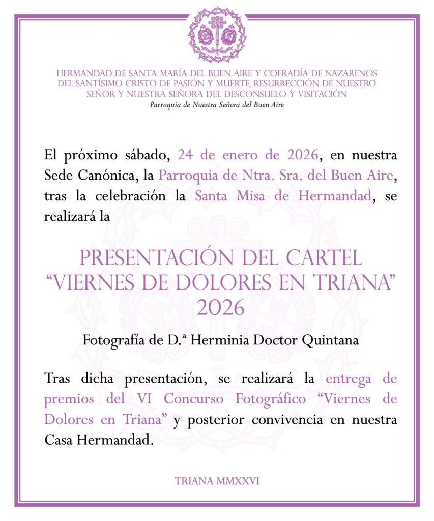 Hoy sábado, 24 de enero, en nuestra Sede Canónica, la Parroquia de Ntra. Sra. del Buen Aire, tras la celebración la Santa Misa de Hermandad, se realizará la presentación del cartel “Viernes de Dolores en Triana” 2026, fotografía de D.ª Herminia Doctor Quintana.