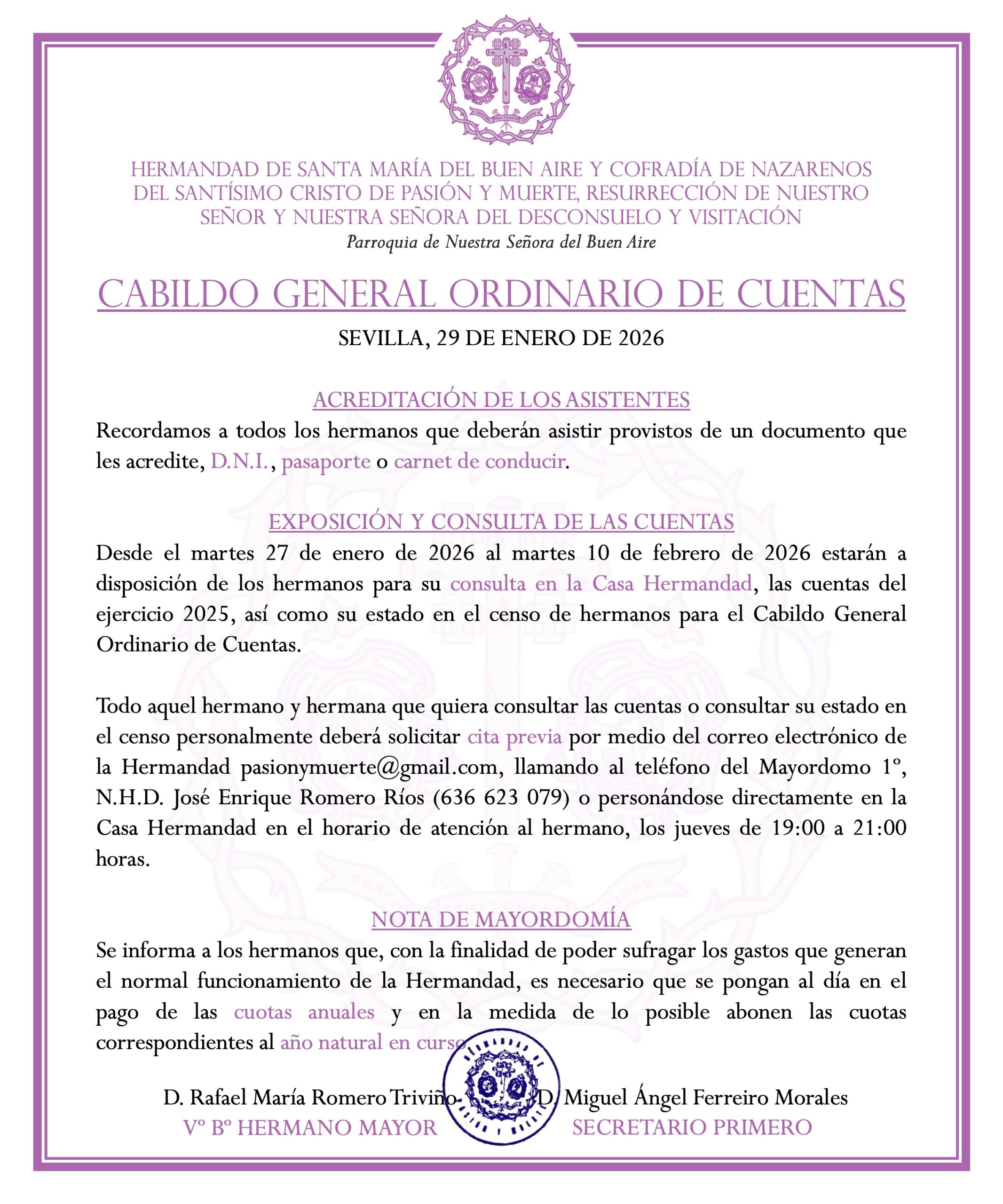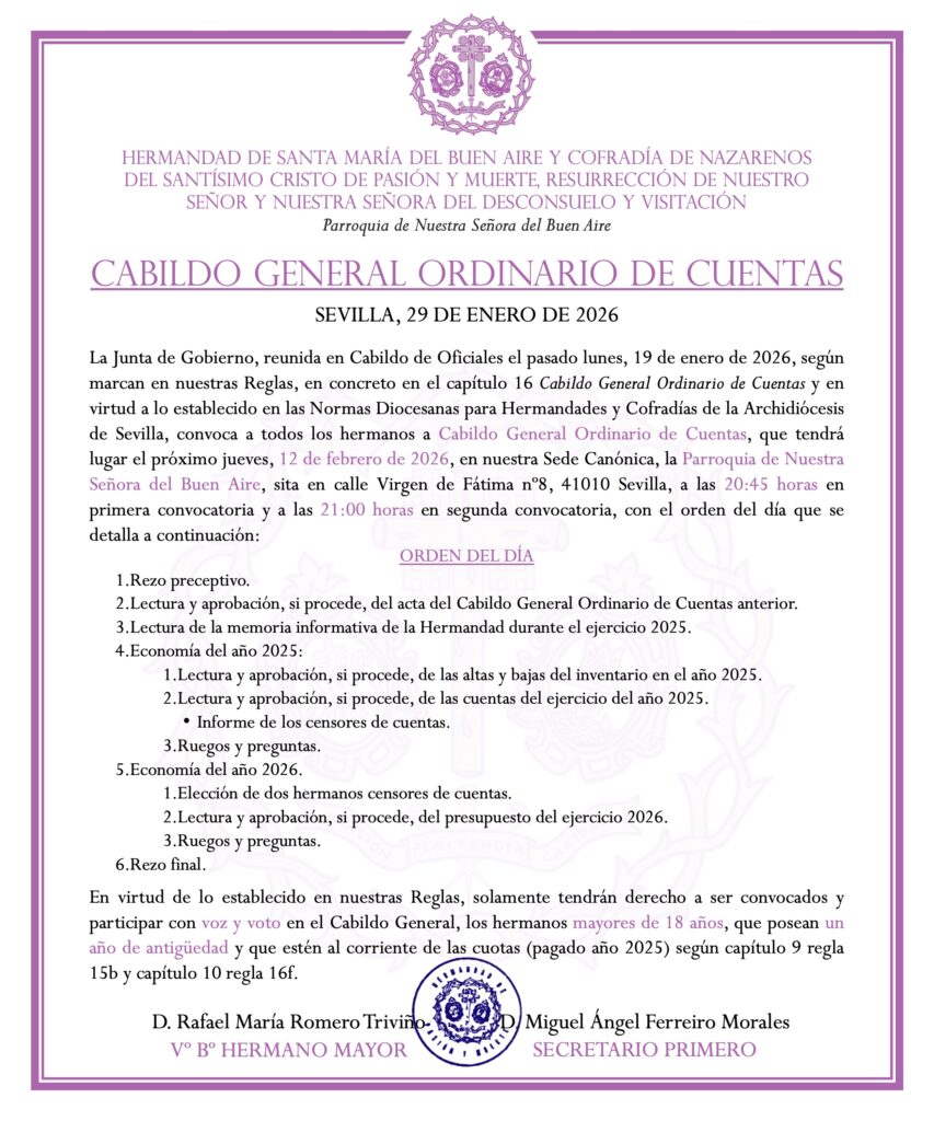 Se convoca a todos los hermanos a Cabildo General Ordinario de Cuentas que tendrá lugar el próximo jueves, 12 de febrero, en nuestra Sede Canónica, la Parroquia de Ntra. Sra. del Buen Aire, a las 20:45 horas en primera convocatoria y a las 21:00 horas en segunda convocatoria.