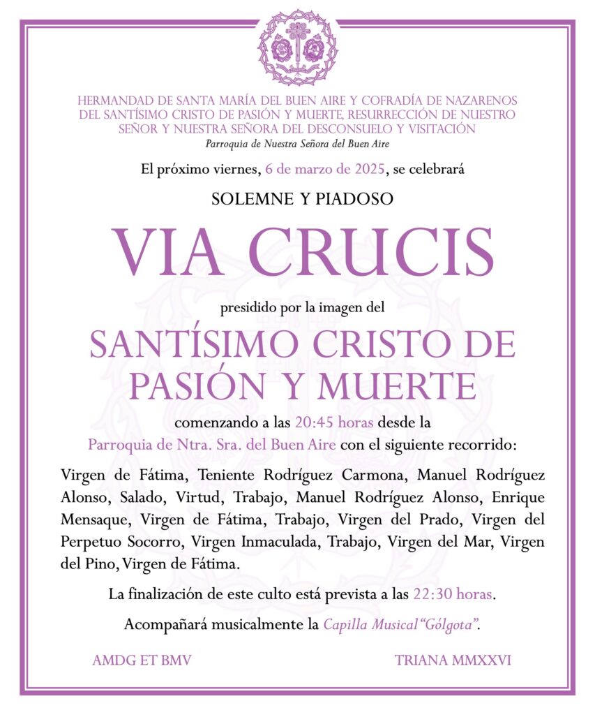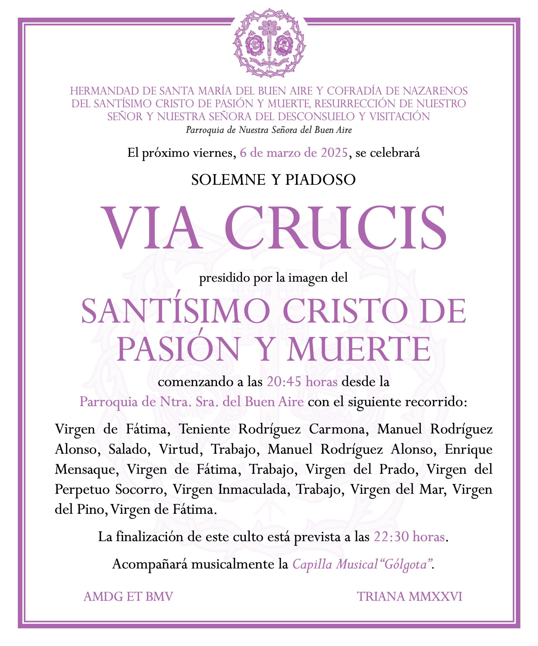 El próximo viernes, 6 de marzo de 2026, se celebrará Solemne y Piadoso Via Crucis presidido por la imagen del Santísimo Cristo de Pasión y Muerte, comenzando a las 20:45 horas desde la Parroquia de Ntra. Sra. del Buen Aire con el siguiente recorrido: Virgen de Fátima, Teniente Rodríguez Carmona, Manuel Rodríguez Alonso, Salado, Virtud, Trabajo, Manuel Rodríguez Alonso, Enrique Mensaque, Virgen de Fátima, Trabajo, Virgen del Prado, Virgen del Perpetuo Socorro, Virgen Inmaculada, Trabajo, Virgen del Mar, Virgen del Pino, Virgen de Fátima. La finalización de este culto está prevista a las 22:30 horas. Acompañará musicalmente la Capilla Musical “Gólgota”.