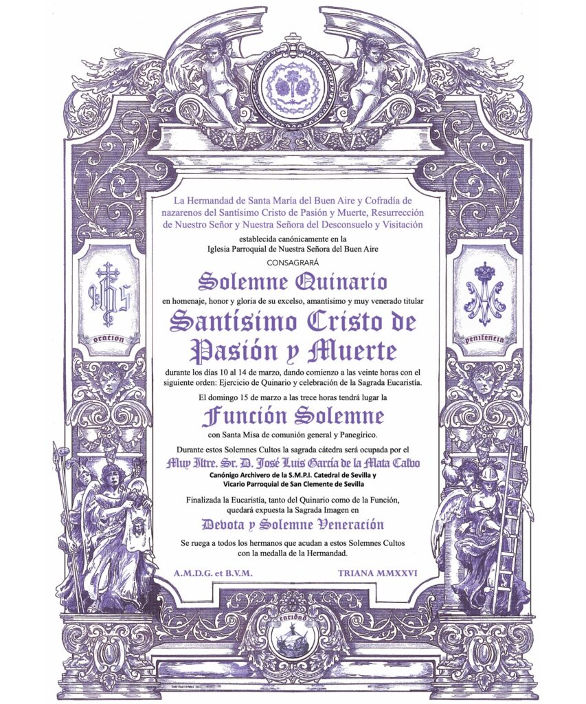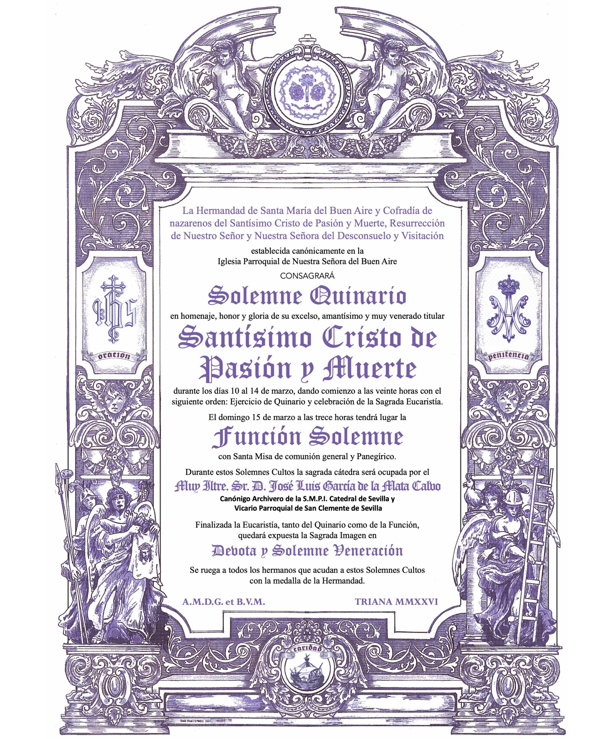 El próximo martes, 10 de marzo, comenzará el Solemne Quinario en honor al Santísimo Cristo de Pasión y Muerte, teniendo lugar a las 20:00 horas en nuestra Sede Canónica, la Parroquia de Ntra. Sra. del Buen Aire.