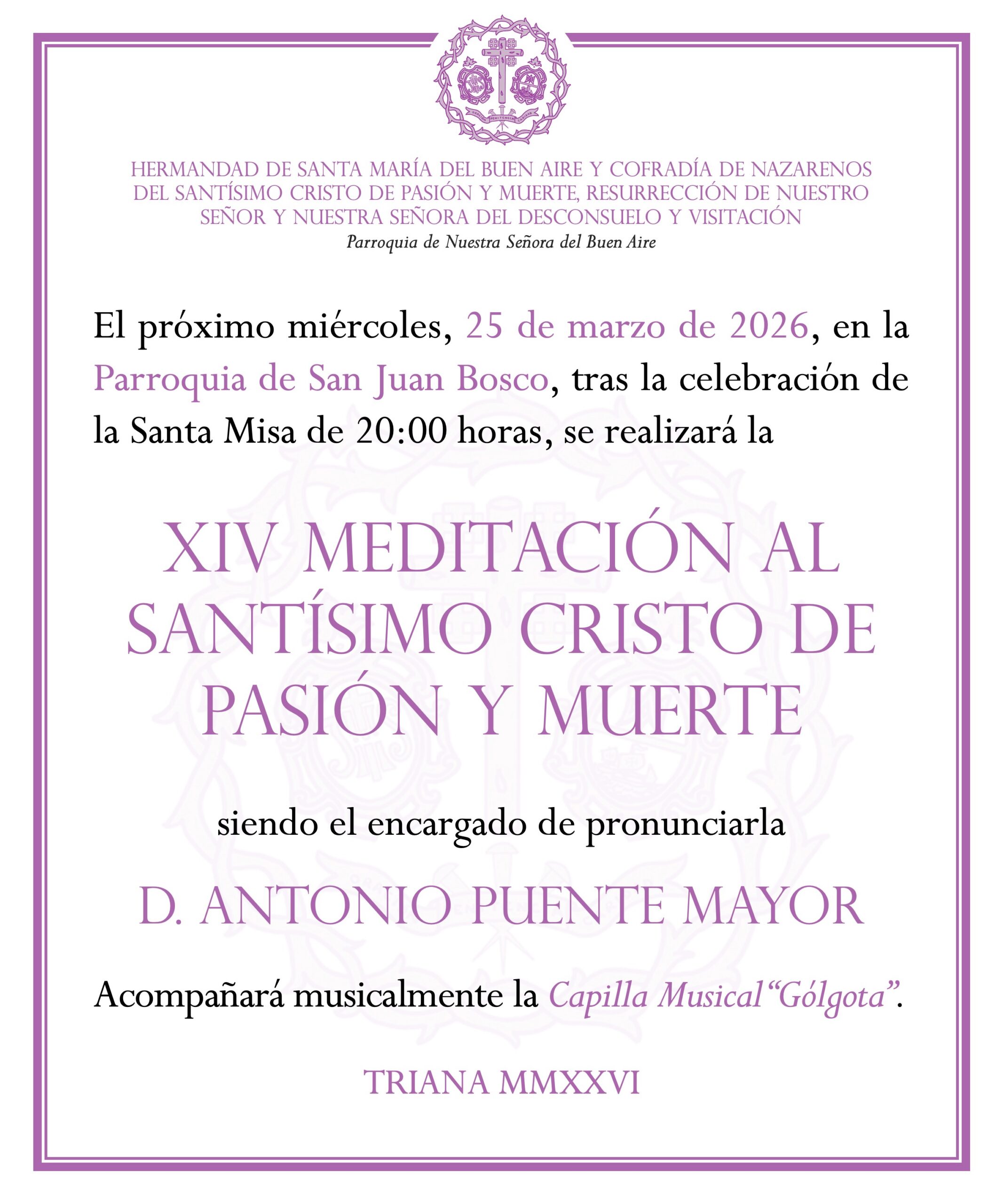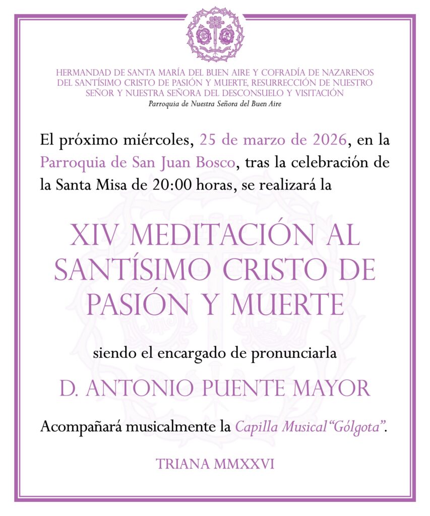 El próximo miércoles, 25 de marzo, en la Parroquia de San Juan Bosco, tras la celebración de la Santa Misa de 20:00 horas, se realizará la XIV Meditación al Santísimo Cristo de Pasión y Muerte siendo el encargado de pronunciarla D. Antonio Puente Mayor. Tendremos el acompañamiento musical de la Capilla Musical “Gólgota”. Rogamos a todos los hermanos asistentes que lleven la medalla de la Hermandad.