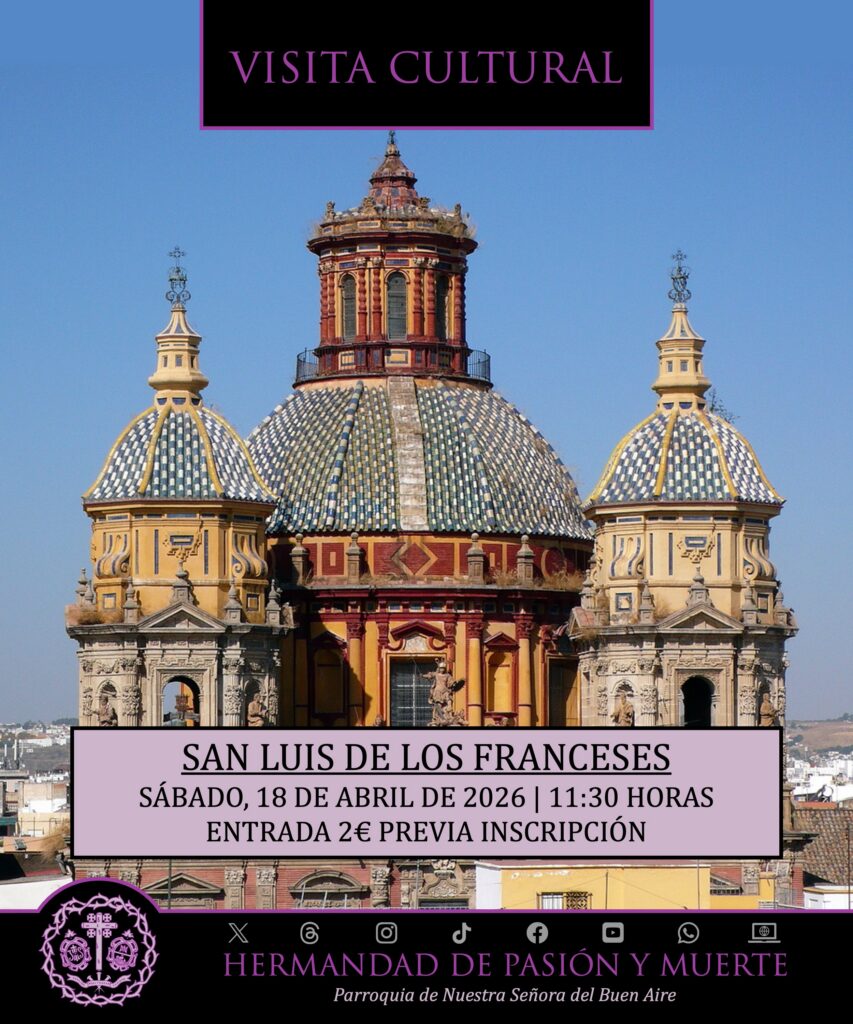 El próximo sábado, 18 de abril de 2026, a las 11:30 horas, nuestra Hermandad realizará una visita cultural al Conjunto Monumental de San Luis de los Franceses y la exposición sobre el patrimonio de los antiguos hospitales de Sevilla, retomando el calendario de visitas culturales tras el tiempo cuaresmal. Se accederá por la puerta principal del Conjunto Monumental ubicado en la calle San Luis nº37, 41003 Sevilla.